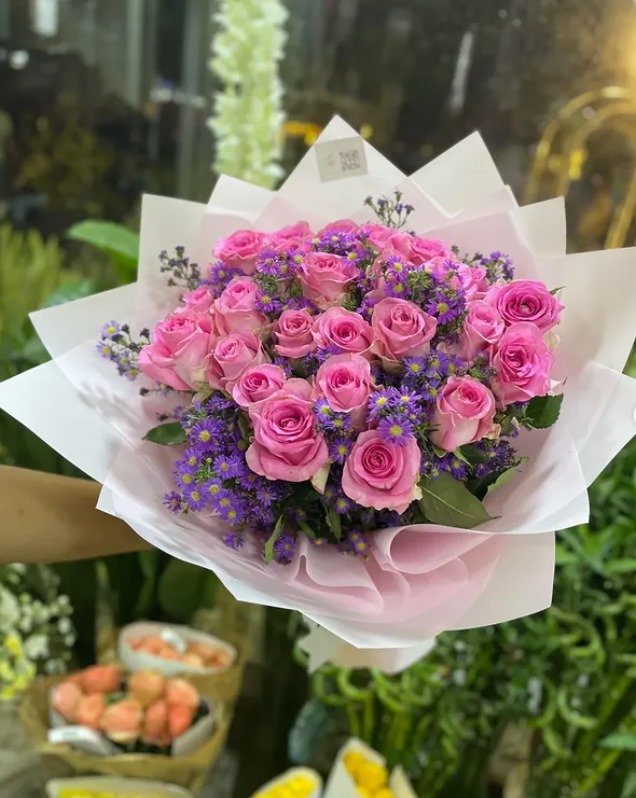 بوكيه ورد وردي طبيعي يتناغم بسحر مع الزهور البنفسجية ليمنح مزيجًا من الرقة والجمال الراقي. يعبر عن المودة، الرومانسية، والمشاعر الصافية. مثالي كهدية للحب أو التهنئة أو لتضيفي لمسة أناقة ناعمة لأي مناسبة.