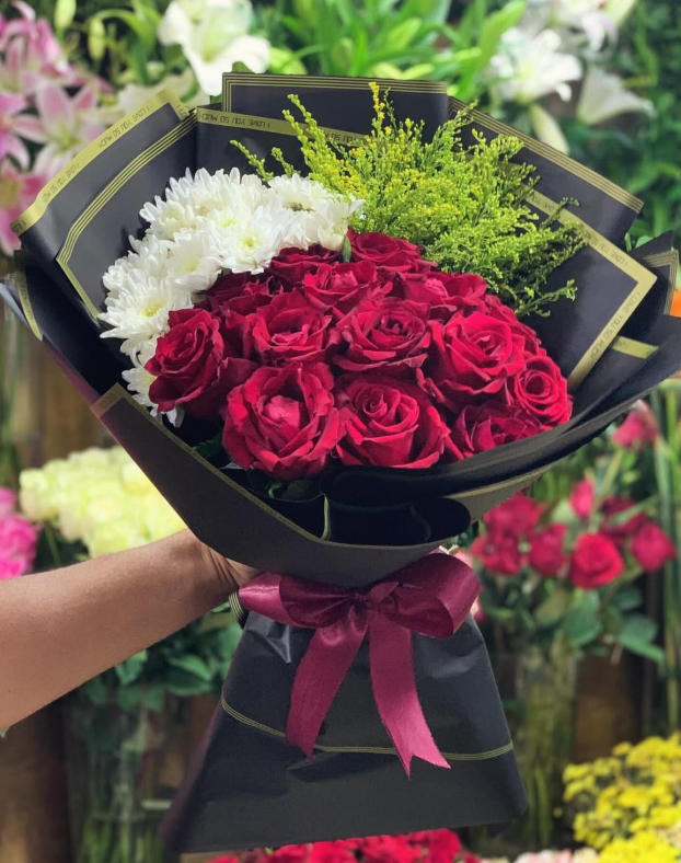 بوكيه ورد احمر مع بيبي فلور و ورد ابيض