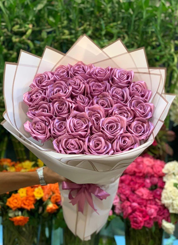 بوكيه أنيق مصنوع من الورد الساتان الفاخر، يتميز بجماله الراقي ولمسته الناعمة التي تدوم طويلاً دون ذبول. مثالي للإهداء في الخطوبة، الزواج، المناسبات الخاصة، والديكور المنزلي. اختيار مثالي لمن يبحث عن لمسة فخامة وأناقة تدوم.
