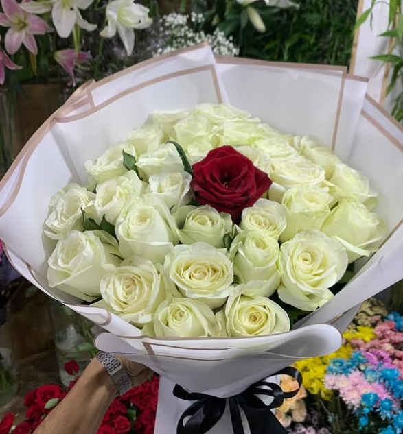 بوكيه ورد ابيض مستورد مع ورده حمره